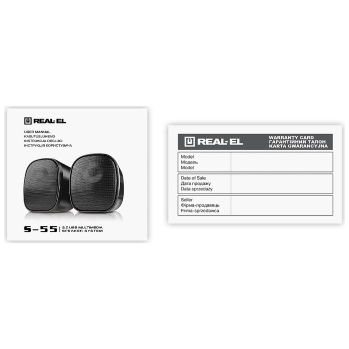 Система підтримує дротове підключення через стандартний роз'єм mini Jack 3.5 мм, що гарантує сумісність із широким спектром пристроїв — від комп'ютерів і ноутбуків до смартфонів і планшетів. Завдяки USB живленню, ви можете використовувати Real-EL S-55 де завгодно — просто підключіть її до будь-якого USB-порту, павербанка або зарядного пристрою.