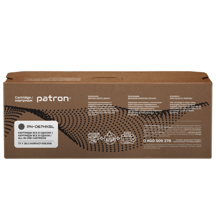 Картридж сумісний Canon 067H жовтий Green Label Patron (PN-067HYGL) оптимальне рішення для лазерних принтерів та БФП. Основні властивості Детальна інформація: Що таке сумісний картридж? Кожен користувач друкувальної техніки стикається з питанням купівлі нового картриджа і знаходить досить велику кількість пропозицій. Як зробити правильний вибір? Розглянемо основні варіанти: Виробники друкувальних пристроїв (т.з. OEM виробники) наполягають на використанні оригінальних картриджів. Їх основний недолік - висока вартість. Сумісні картриджі виробляються різними компаніями - сторонніми виробниками. Вони дають можливість істотно заощадити на друці, проте питання оптимального балансу між якістю друку, ціною, гарантією та ресурсом картриджа залишається вибором Покупця. Картридж сумісний Canon 067H жовтий Green Label Patron (PN-067HYGL) гарантія Ми гарантуємо 12 місяців справної роботи картриджа та проведемо заміну продукції з виробничим дефектом. Якість друку Картриджі серії Patron Green Label виготовляються з використанням нових корпусів та повністю придатні для повторної заправки. Основна відміна серії Patron Green Label від картриджів низького цінового сегменту – якість комплектуючих, що забезпечує високу оптичну щільність друку, а також ресурс, аналогічний оригінальному картриджу. При виробництві картриджів Patron Green Label виробник дотримується загального стандарту ISO 9001:2015 і спеціальні стандарти, що використовуються в індустрії друку - ISO 19752:2017 для монохромних картриджів ISO 19798:2017 - для кольорових картриджів, а також STMC стандарт для контролю ресурсу. Захист навколишнього середовища Виробництво картриджів Patron Green Label відбувається з виконанням вимог міжнародного стандарту по захисту навколишнього середовища - ISO 14001:2015. Залишки матеріалів і комплектуючих, що використовуються для виробництва картриджів Patron Green Label, передаються на утилізацію відповідно Закону України "Про відходи". Для виробництва картонної упаковки ми використовуємо перероблені матеріали з нанесенням мінімальної кількості фарби. А конструкція коробки для картриджа дозволяє кілька разів відкривати і закривати його на "замок" для транспортування в сервісний центр. Ми закликаємо до нанесення мінімального впливу на довкілля. Тому заправляйте і відновлюйте картриджі Patron Green Label. Картридж сумісний Canon 067H жовтий Green Label Patron (PN-067HYGL) економія на офісному друці Вартість  картриджів серії Patron Green Label в середньому  на 70-80% нижче  оригінальних витратних матеріалів. Оптимальне співвідношення ціна-якість робить дану продукцію хорошим вибором для Клієнтів, що бажають заощадити на друці і не прогадати з якістю. Зовнішній вигляд Ми потурбувалися про те, щоб упаковка картриджа була не лише екологічною, функціональною, мала мінімально можливі фізичні розміри, але і містила усю необхідну інформацію. На зеленій етикетці знаходиться інформація про картридж, його сумісність з друкувальними пристроями, номер партії, дата виготовлення, контакти виробника, а також номер телефону безкоштовної гарячої лінії для українських споживачів. Сподіваємось, що наведена інформація дозволить  Вам зробити правильний вибір. Ваш друк – наша турбота! Оптимальний варіант  для користувача, що хоче заощадити;При виробництві картриджа використовується новий корпус;Гарантований  ресурс;Економія 70-80% у порівнянні з оригінальними витратними матері