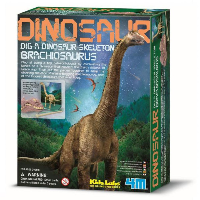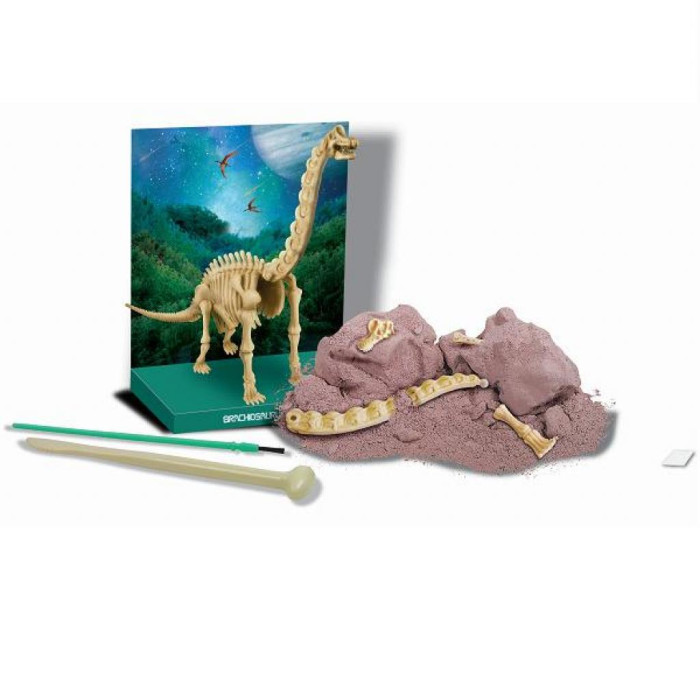 З набором дитина зможе відчути себе палеонтологом і провести розкопки стародавньої тварини. У коробці ви знайдете гіпсовий брикет та інструменти: молоточок зі скребком і пензлик. За їх допомогою дитина знайде кістки, а потім акуратно збере весь скелет, скріпивши його м'яким воском. Завдяки докладній інструкції, доповненій цікавими фактами, заняття пройде цікаво, а юний археолог дізнається багато нового про викопних тварин, що мешкали на планеті Земля.