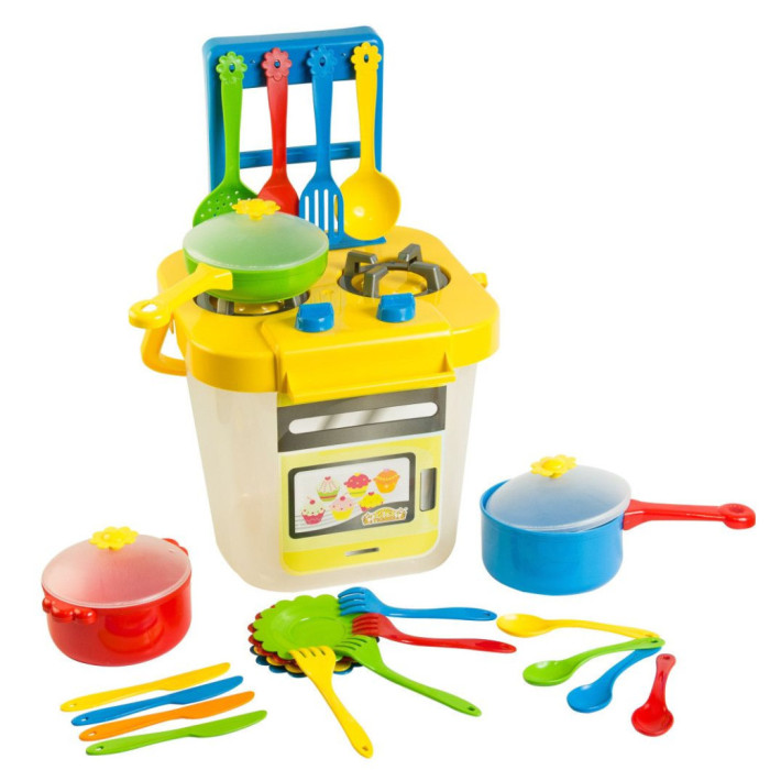 Іграшкова посудка з плитою Ромашка включає чудову газову плиту з двома конфорками, підставкою під кухонне приладдя і відерце, яке імітує духовку. Навпроти кожної конфорки є вмикач, повернувши його, чується клацання. Крім того, набір також включає каструлю, 2 сковорідки зі знімними ручками, ополоник, шумівку, 2 лопатки і тарілки, ножі, виделки, ложки на 4 персони. Вся посудка складається в прозоре відерце, яке має зручну ручку для перенесення всього набору. Таким чином, їм буде зручно грати як вдома, так і у дворі.