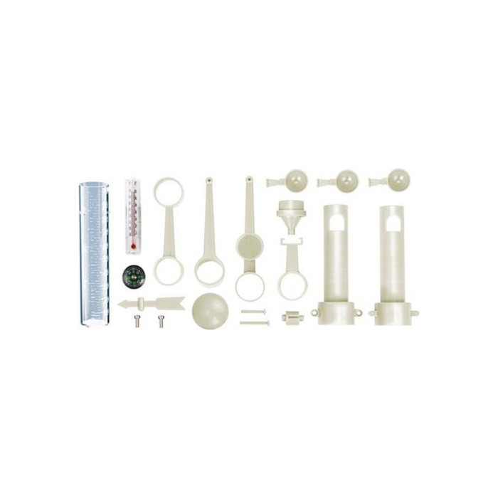 За допомогою анемометра ви вимірюватимете силу вітру. Чаші анемометру вловлюють повітряні потоки і починають обертатися, показуючи швидкість вітру. Флюгер та компас вказують його напрямок. Датчик дощу метеостанції вимірює кількість опадів: краплі потрапляють до воронки і збираються у вимірювальній трубці. Термометр показує температуру повітря: спеціальна рідина всередині колби розширюється, коли повітря навколо неї нагрівається, і стовпчик піднімається трубою вгору. Коли температура навколо термометра падає, рідина охолоджується і опускається вниз стовпчиком термометра.