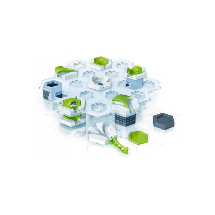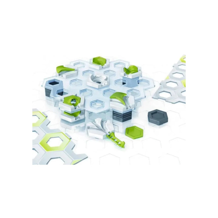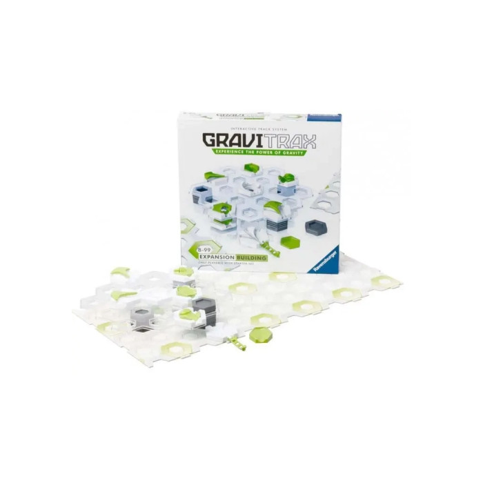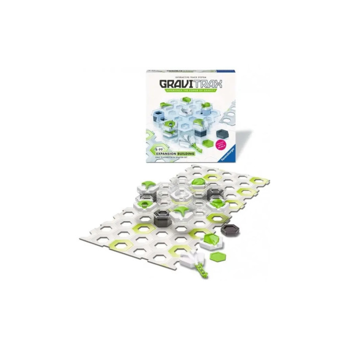 Комбінуйте додаткові плитки для підлоги й інші елементи за допомогою стартового набору GraviTrax і створіть гігантську модульну систему треків для куль. Перевірте, за час м'яч може досягти цілі! Розширивши базовий набір додатковим набором — будівлі, ви створите нові захопливі треки.