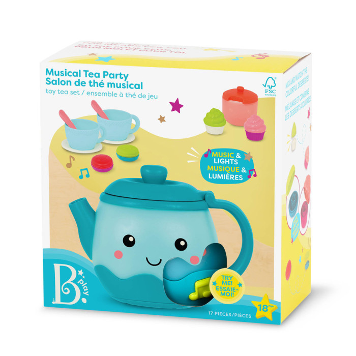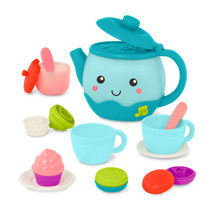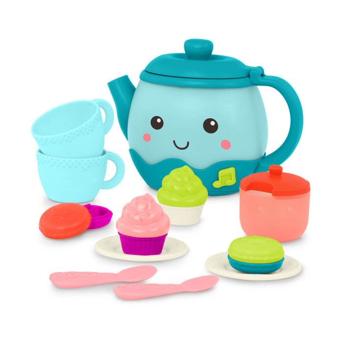 Набір для чаювання: влаштуйте справжню вечірку з чайником з музичним підсвічуванням, який грає пісні та видає реалістичні звуки наливання чаю, та аксесуарами для сортування форм. Включає 17 предметів: 1 музичний чайник, 2 чайні чашки, 2 ложки, 2 тарілки, 4 деталі макаронсів, 4 шматочки кексів і 1 цукорницю з кришкою. Іграшка, що розвиває, 3-в-1: гра з набором допомагає дітям розвивати дрібну моторику, рольова гра допоможе в розвитку соціальних навичок, елементи сортера розвинуть логіку. Малюк може налити чай в дві чашечки та запитати, додати одну ложечку цукру чи три. Деталі кексів та макаронсів з’єднуються між собою за принципом сортера – малюку потрібно правильно поєднати фігури. Набір зручний для маленьких ручок: Чайник та аксесуари дозволяють дітям взяти на себе ініціативу під час гри та влаштувати власне чаювання! Живлення: 3 батарейки типу ААА (входять в комплект).
