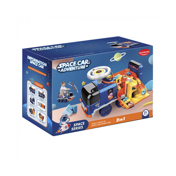 Машинка-толокар 2 в 1 Mountainking Космос дозволить дитині весело провести час. В ній об'єднані каталка та трек для гри з маленькими машинками. Набір яскравих наліпок, що входить до комплекту, допоможе дитині самостійно оформити транспорт. Кермо толокара оснащено кнопками, одна з яких включає світлові ефекти, інша – дозволяє машинці рухатися самостійно. На задній частині корпусу розташовані п'ять кнопок, при натисканні на які лунають звуки авто та весела музика. Під сидінням є багажне відділення, де зберігається автопарк з 4 машинок. Під час катання на толокарі, дитина розвиває свій опорно-руховий апарат. ОСОБЛИВОСТІ МАШИНКИ-ТОЛОКАРА 2 В 1 MOUNTAINKING КОСМОС: під сидінням розташований розкладний автотрек, який має різні функції: транспортний ліфт, зміна смуги руху, паркування; іграшка розроблена з урахуванням безпеки дитини: міцна та стійка конструкція, гладкі края; живлення здійснюється від батарейок 4 х АА (не входять до комплекту); комплектація: толокар – 1 шт., іграшкові машинки – 4 шт., набір наліпок – 1 шт.