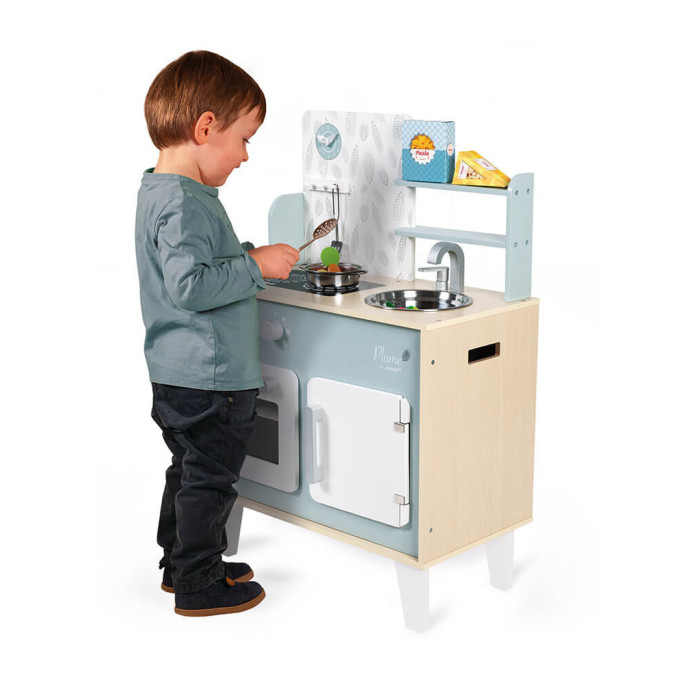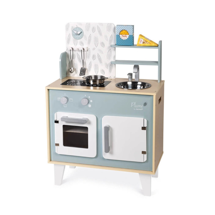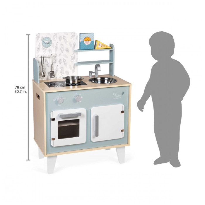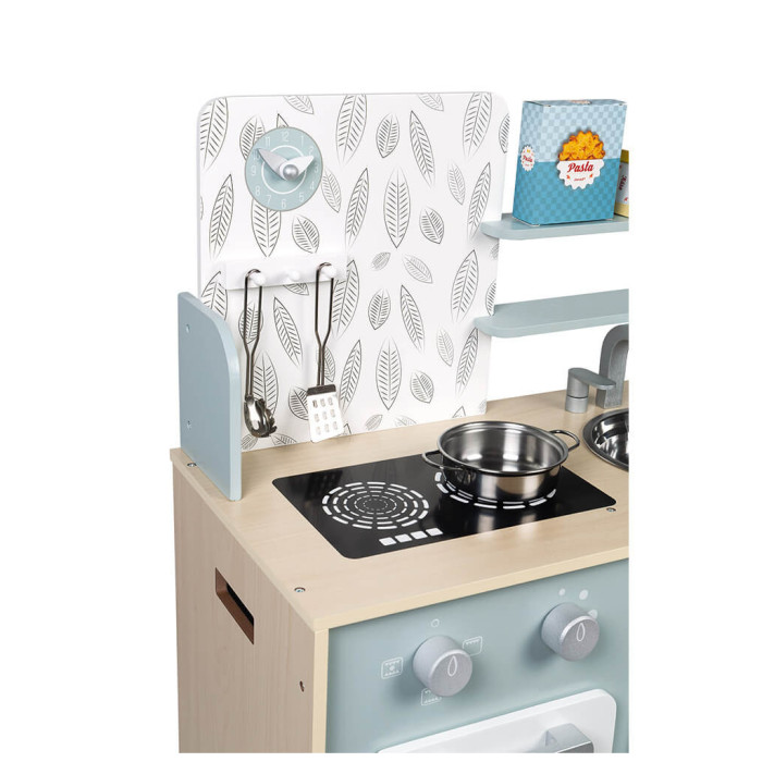 Кухня, виконана з натурального дерева, пофарбована у ніжні блакитні та сірі тони, має безліч аксесуарів: гачки для підвішування кухонного приладдя, таких як ложка для спагеті та металева лопатка, каструля з металу та дві картонні коробки з "їжею" - макарони та сир, щоб ігровий процес став ще цікавішим.