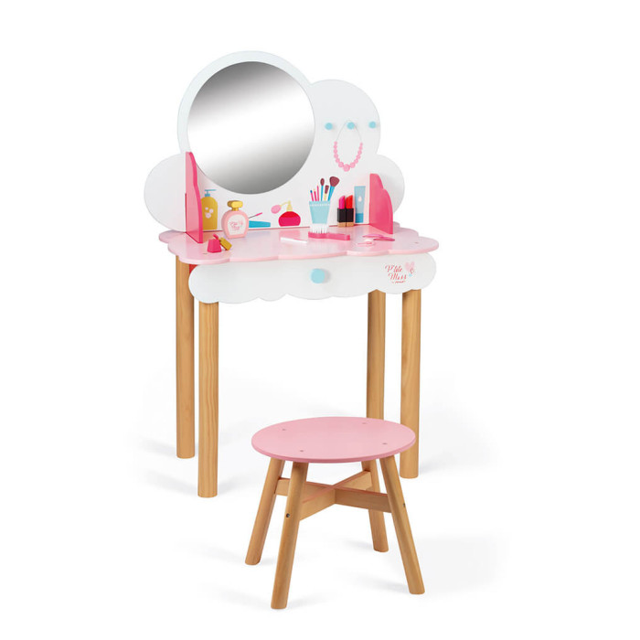 Дерев’яний туалетний столик від Janod створений спеціально для дітей і дозволяє їм відчути себе дорослими, збираючись разом із батьками. Столик оснащений великим дзеркалом та шухлядою, де можна зберігати важливі дрібнички або секрети. Він також має три гачки для підвішування намиста та браслетів, що додає практичності.