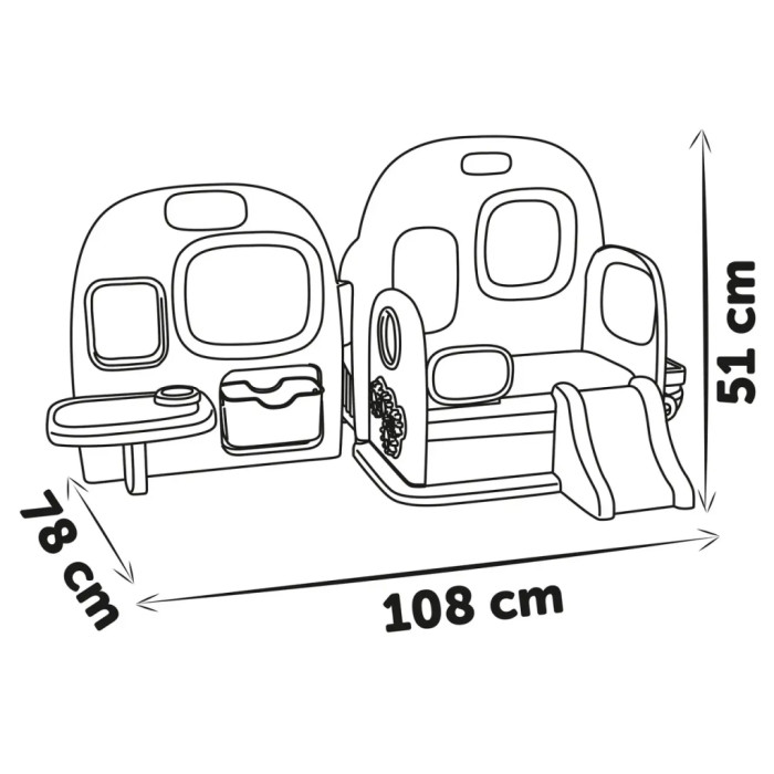 вхідна зона з гачками для одягу, шухлядкою для аксесуарів, годинником на стіні та дошкою для навчання;ігрова зона з складним манежем;гігієнічна зона з ванною кімнатою з унітазом, раковиною та рулоном туалетного паперу;зона відпочинку з двоярусним ліжком, гіркою та шухлядами для зберігання;суміщена обідньо-творча зона з столиком та дошкою для малювання і навчання.
