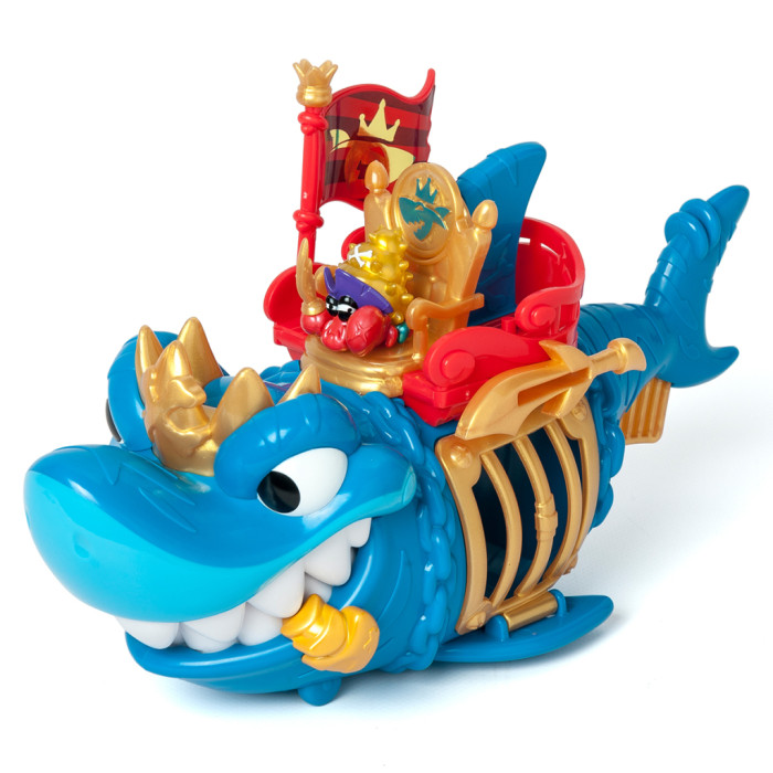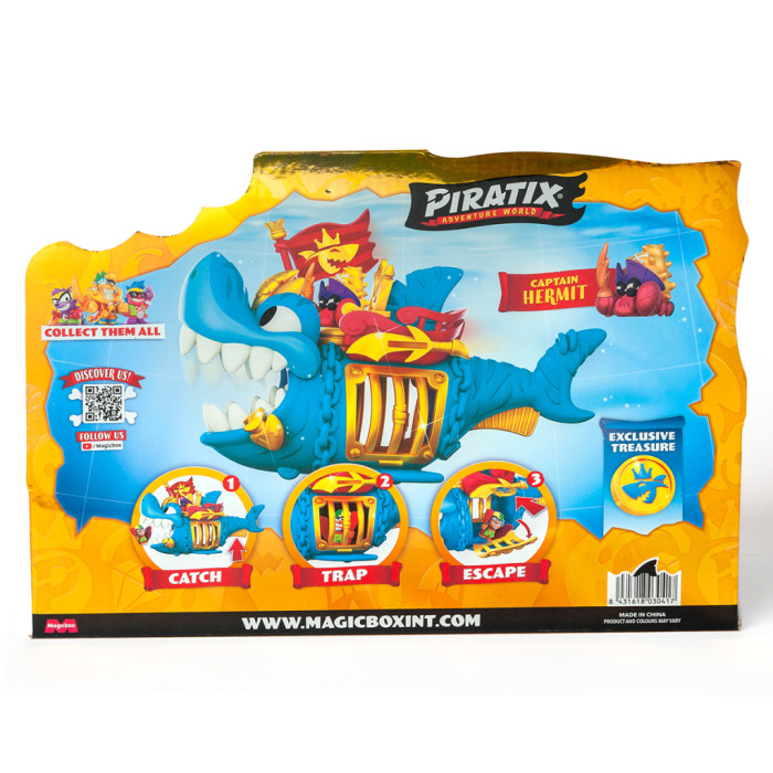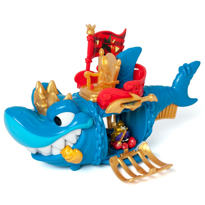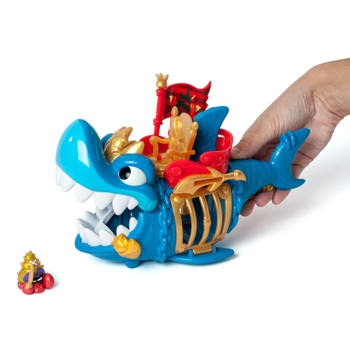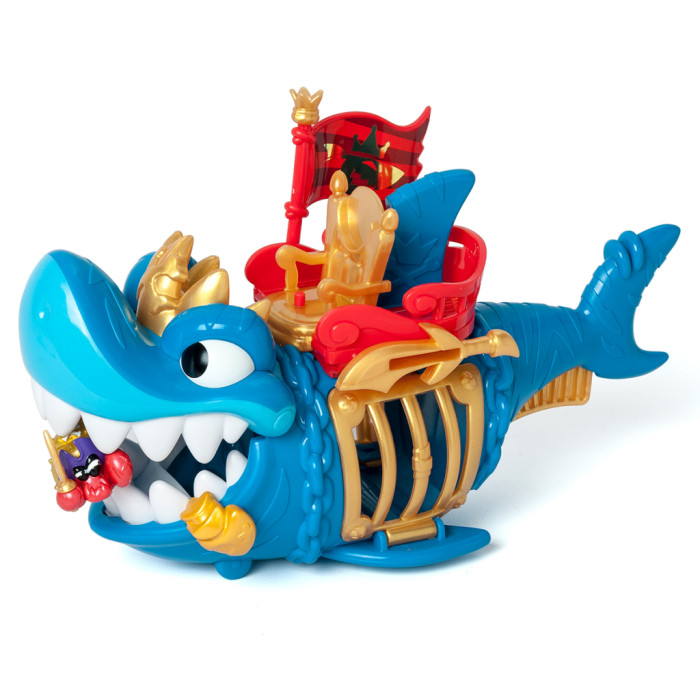 - Деталізований дизайн акули із золотистими елементами робить гру ще більш захопливою! У наборі є ексклюзивна фігурка капітана Піратікса із золотистими елементами та золотистим аксесуаром у вигляді іграшкової зброї. Розпочніть свою мандрівку! Вставте прапор з правої сторони у тримач, посадіть капітана на трон і рушайте! На череві акули є рухомі колеса, завдяки яким ви можете рухати акулу по поверхні. Захоплюйте піратів в акулячу пастку! Натисніть на золотистий важіль-плавник під хвостом акули, щоб вона розкрила пащеку й помістіть фігурки піратів-в’язнів всередину. Для того, щоб звільнити в’язнів, вам знадобиться ексклюзивна монета із зображенням акули з набору. Вставте монету в отвір меча над лівим боком акули й натисніть – відчиниться решітка. Розмір акули – 27 см. Діаметр ексклюзивної монети – 2,7 см. Розмір фігурки близько 4 см (залежно від героя та аксесуарів).