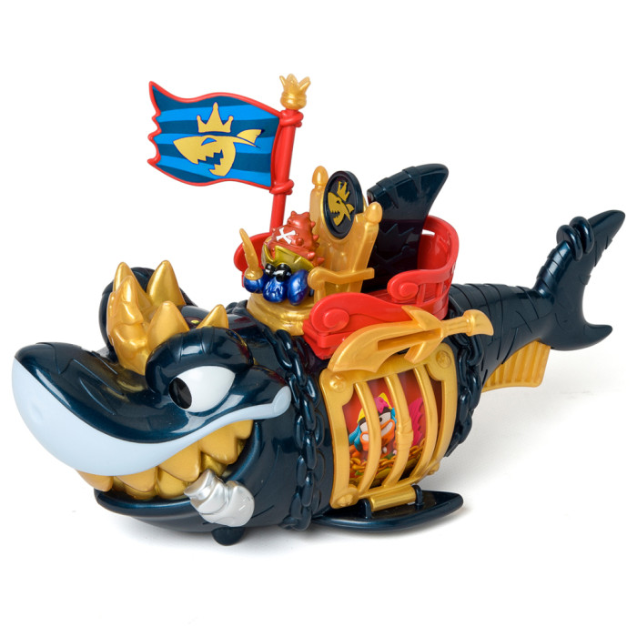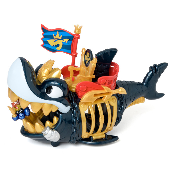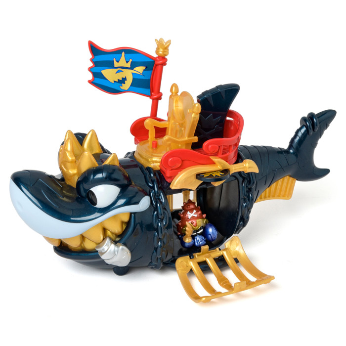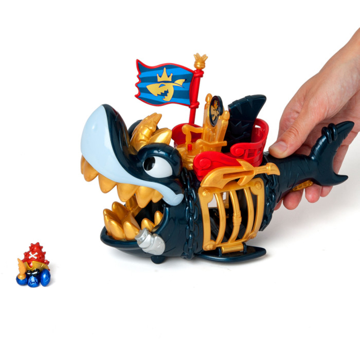 - Деталізований дизайн акули із золотистими елементами робить гру ще більш захопливою! У наборі є ексклюзивна фігурка капітана Піратікса із золотистими елементами та золотистим аксесуаром у вигляді іграшкової зброї. Розпочніть свою мандрівку! Вставте прапор з правої сторони у тримач, посадіть капітана на трон і рушайте! На череві акули є рухомі колеса, завдяки яким ви можете рухати акулу по поверхні. Захоплюйте піратів в акулячу пастку! Натисніть на золотистий важіль-плавник під хвостом акули, щоб вона розкрила пащеку й помістіть фігурки піратів-в’язнів всередину. Для того, щоб звільнити в’язнів, вам знадобиться ексклюзивна монета із зображенням акули з набору. Вставте монету в отвір меча над лівим боком акули й натисніть – відчиниться решітка. Розмір акули – 27 см. Діаметр ексклюзивної монети – 2,7 см. Розмір фігурки близько 4 см (залежно від героя та аксесуарів).