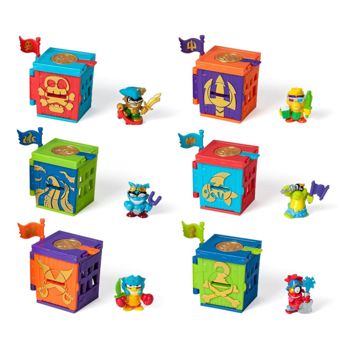 Ефект-сюрпризу – позитивні емоції як для дітей, так і для дорослих! Усього є 6 видів фортець, як і 6 банд піратів. У кожної з них – різне колірне забарвлення і свій знак. В асортименті 36 варіацій фортець. Знайдіть рідкісні золотисті фортеці, де живуть капітани піратів! Натисніть і спіймайте! Опустіть виступ-катапульту на даху фортеці вниз і монетка вистрибне. Покрутіть! Вставте монетку в отвір на дверях з малюнком, покрутіть, щоб малюнок став цілісним, і відчиніть дверцята. Якщо головоломку виконати неправильно, ви не відчините двері. Дістаньте! Ура, нарешті ви знайшли загадкового пірата й тепер залишилося лишень поставити прапор на фортецю у виступ збоку. Складайте! Поставте будиночки-фортеці один на одного, щоб створити «Місто-фортецю». Деталізований і яскравий дизайн фігурок робить гру ще більш захопливою! У кожного героя є свій аксесуар у вигляді іграшкової зброї, яку можна змінювати між іншими персонажами. Висота фортеці – 6 см. Діаметр ексклюзивної монети – 2,7 см. Розмір фігурки близько 4 см (залежно від героя та аксесуарів).