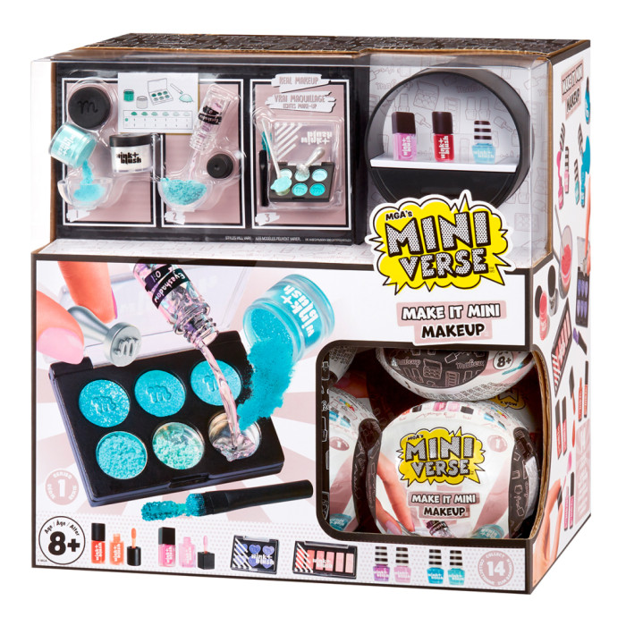 Розпакуйте! Кожна кулька містить мініатюрні косметичні елементи: крихітні баночки, пензлики, пігменти, рідину для блиску, а також мініполичку або підставку. Який саме набір вам дістанеться — дізнаєтеся лише після розпакування! Створіть! Порівняйте вміст Вашого набору з посібником колекціонера, щоб зрозуміти, який косметичний засіб потрапив до Вас. За допомогою інструкції «змішайте» компоненти у відповідних пропорціях, щоб створити справжню косметику! Продемонструйте! Помістіть свою мінікосметику Miniverse на стіл чи поличку, які водночас є і вітриною! В асортименті 14 унікальних косметичних наборів, які можна використовувати в дорозі, щоб підправити макіяж! Збирайте! На цьому веселощі не закінчуються! Мініаксесуари та пакування дуже милі для колекціонування. Від мініверсії інгредієнтів і баночок до аплікаторів і наліпок - у серії "Мейкап" є понад 30 унікальних елементів, пакування та аксесуарів, які ви можете колекціонувати. Створіть свій власний б’юті-куточок!