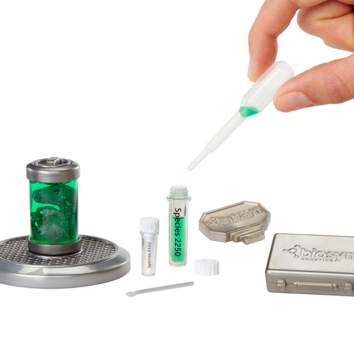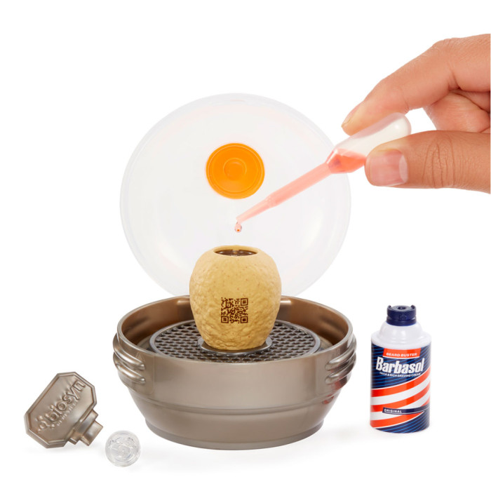 набір для створення динозавра (фігурка у яйці або капсулі, пробірка з рідиною, пробірка з гліттером, піпетка, ложка), підставка, кулька, трубка, інструкція.