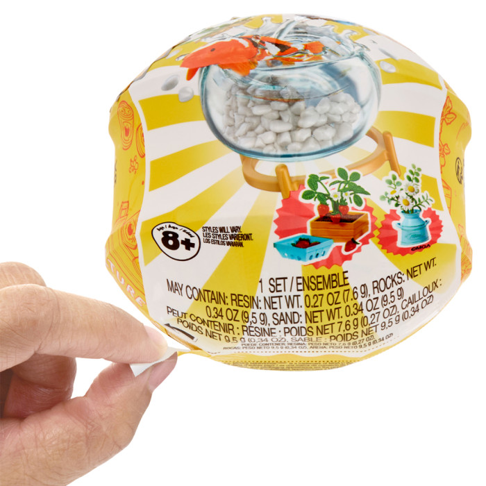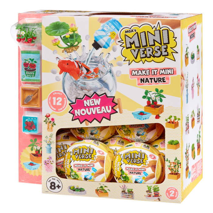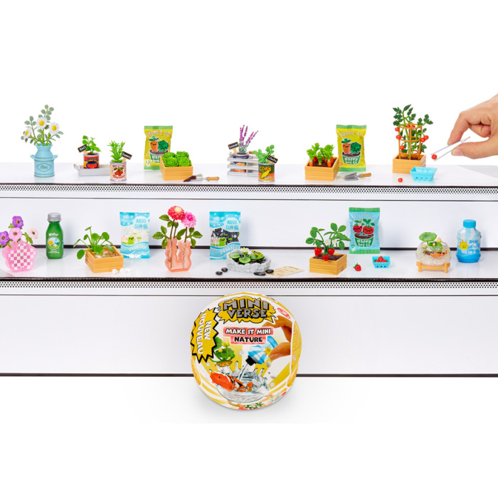 Розпакуйте! Кожна кулька містить реалістичні мініатюрні елементи саду й городу: квіти, овочі й навіть мініакваріуми! Який саме набір вам дістанеться — дізнаєтеся лише після розпакування! Створіть! За допомогою інструкції «створіть» власний унікальний іграшковий декор для куточка природи. Для деяких мініатюр з набору може знадобитись сонячне світло або ультрафіолет: закінчивши створення мініатюри, поставте її під сонячне світло або ультрафіолет, доки смола не затвердіє. Якщо ви створюєте акваріум чи якийсь об’ємний предмет, то додавайте смолу у декілька рівнів, для кращого застигання смоли. Щойно вона застигне, ваш колекційний експонат готовий до показу! Продемонструйте! Помістіть свій мінісад Miniverse на полицю, яка водночас є і вітриною! В асортименті 12 унікальних куточків природи. Збирайте! На цьому веселощі не закінчуються! Мініаксесуари та пакування дуже милі для колекціонування. Від мініверсії інгредієнтів і рослин до декору і наліпок - у серії " Nature 2" є понад 30 унікальних елементів, пакування та аксесуарів, які ви можете колекціонувати. Створіть свій власний мінісвіт!