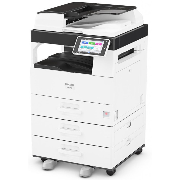 Ricoh IM 2702 - це багатофункціональний пристрій формату A3 з інтелектуальними функціями. Панель управління з кольоровим сенсорним екраном спрощує управління і підтримує інтеграцію з хмарою. На смарт-панелі управління розташований цілий набір інструментів для управління робочим процесом. Офлайн інтелектуальні додатки оптимізують тривалі процеси (наприклад, копіювання посвідчень особи). Користувачі можуть підключатися до МФУ з своїх смартфонів і планшетів для виконання сканування і друку. Крім того, завдяки інтеграції з хмарою вони можуть сканувати документи і вивантажувати їх в такі служби, як DropBox ™ і Sharepoint ™. IM 2702 є максимально універсальним і підтримує чорно-білий друк і копіювання, а також кольорове сканування. Функція факсу пропонується в якості опції. Реверсивний АПД забезпечує швидке сканування двосторонніх оригіналів і швидке копіювання багатосторінкових документів. Пристрій може оснащуватися трьома лотками і забезпечує друк на папері різного формату, а також друк на конвертах і наклейках. МФУ підтримує різні мови, включаючи російську, що спрощує локалізацію. Крім того, IM 2702 відрізняється простотою установки і забезпечує можливість самостійного обслуговування, гарантуючи надійну роботу.