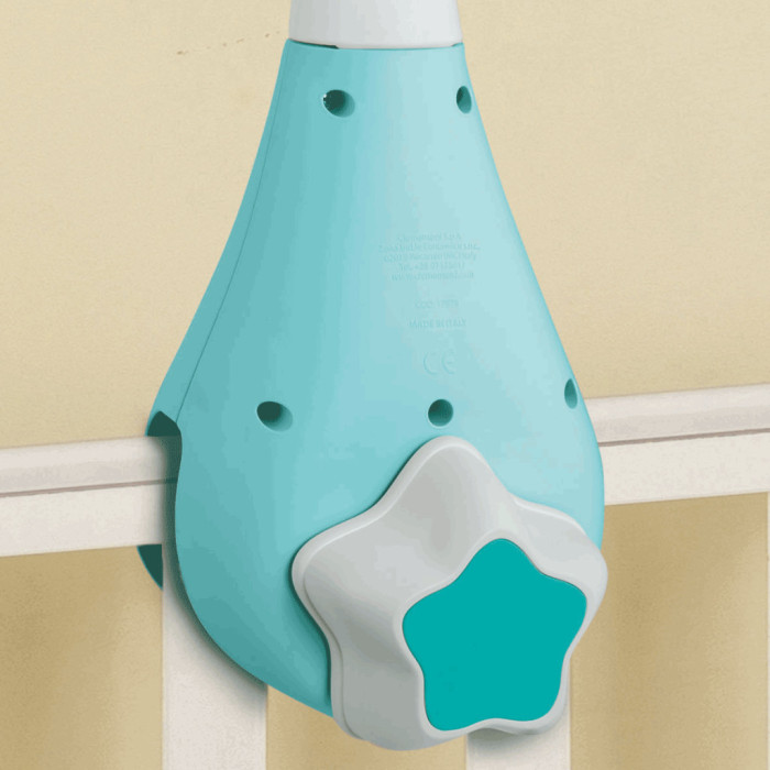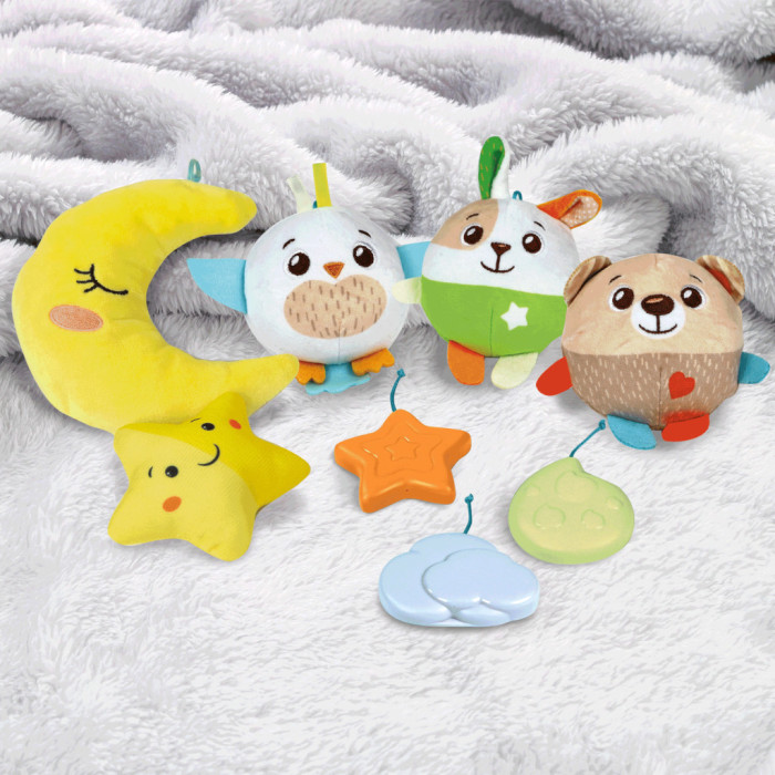 електронний модуль-хмаринка перетворюється на портативний ігровий центр, який можна взяти з собою будь-куди;м'яке світло, ніжні мелодії та звуки природи створюють спокійну та безтурботну атмосферу, що допомагає заснути;рухливі підвіски стимулюють уяву та сприяють розвитку координації рухів, зорового та слухового сприйняття;таймер на 10, 15 або 20 хвилин;зручний механізм кріплення до ліжечка;для дітей від народження.