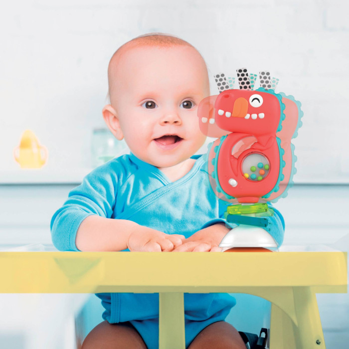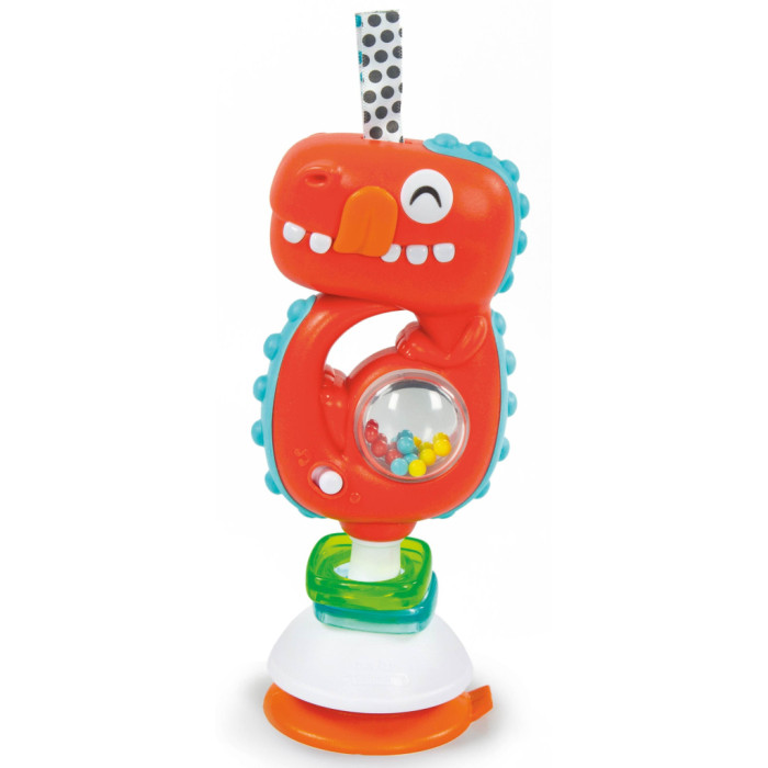 похитування брязкальця активує кумедні мелодії та звукові ефекти, які за потреби, можна вимкнути;кольорові кульки та підвіски привертають увагу дитини;практична присоска надійно утримує брязкальце на плоскій поверхні, наприклад стільниці чи столі;для дітей від 3-ох місяців.