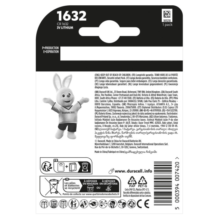 Спеціальні літієві батарейки типу «таблетка» Duracell CR 1632 мають гарантовано довгий термін служби у ваших спеціалізованих пристроях. Для забезпечення безпеки ваших дітей вони спроектовані з упаковкою Baby Secure, яка має подвійний блістер, що важко відкрити без ножиць. Вони підходять для використання в автомобільних ключах, в різних видах пультів дистанційного керування, фітнес-годинниках та інших носимих пристроях, калькуляторах, камерах, сенсорах, автомобільних сигналізаціях, медичних пристроях (глюкометрах, цифрових термометрах). З гарантією зберігання до 10 років, ви можете бути впевнені, що вони будуть готові до використання, коли вони вам знадобляться.