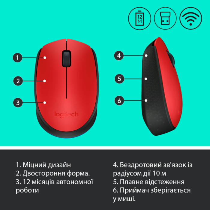Мишка Logitech M171 Red (910-004641) — це поєднання стилю, якості та зручності, що ідеально підходить для користувачів, які цінують комфорт і ефективність. Цей бездротовий пристрій, виготовлений з акцентом на оптимальну продуктивність, стане вашим незамінним помічником у будь-якій роботі з ноутбуком.