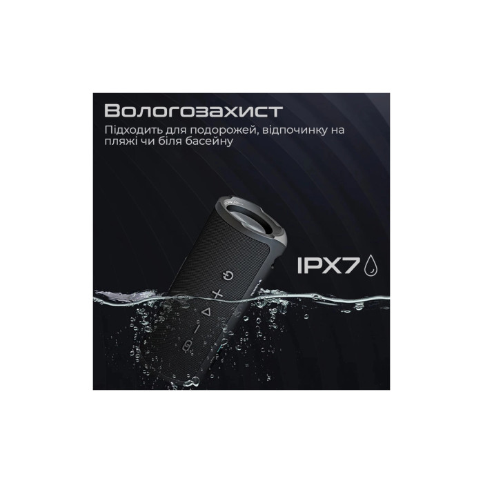 Колонка має два режими EQ – на вибір між збалансованим звучанням та потужними басами. Достатньо одного дотику кнопки, щоб відчути різницю. Водонепроникність рівня IPX7 означає, що ви можете насолоджуватися музикою без жодних хвилювань про дощ чи бризки.