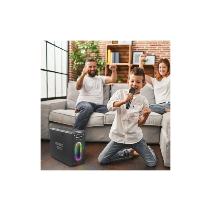 Окремої уваги заслуговує функція караоке з бездротовим мікрофоном, яка надасть ще більше задоволення під час вокальних батлів з друзями. MusicBox також оснащена динамічним RGB-підсвічуванням, що створює атмосферу справжньої дискотеки завдяки безлічі режимів світіння. Для поціновувачів якісного звуку передбачено перемикання між режимами еквалайзера: обирайте баланс або ж потужні баси.