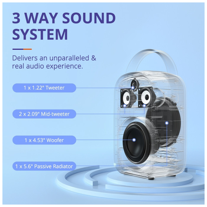 Одна з головних переваг Tronsmart Halo 100 — це її виняткова потужність у 60 Вт, яка дозволяє наповнити якісним звуком навіть найбільші приміщення або відкриті простори. Завдяки двосмуговій акустичній системі, колонка демонструє багатий і насичений звук, який захопить з першої ноти. Глибокі баси, чіткі середні частоти і яскраві високі ноти створюють повне акустичне занурення, яке важко не оцінити.