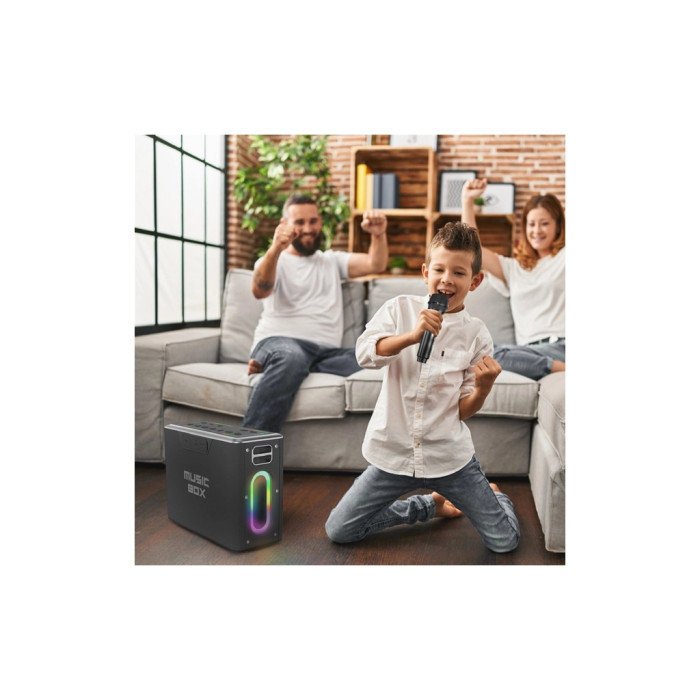 Однією з унікальних переваг є функція караоке зі вбудованою системою покращення голосу та двома мікрофонами, що входять у комплект. Це дозволяє влаштувати справжнє вокальне шоу вдома або на природі.
