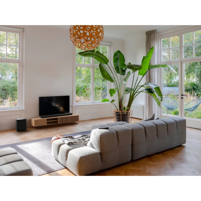 Бездротовий сабвуфер Enchant Sub доповнює систему щільним, контрольованим басом, що органічно інтегрується з саундбаром. Разом вони формують узгоджений тандем для фільмів, спорту та музики — лаконічний дизайн і просте під’єднання залишають у фокусі лише емоції від перегляду.
