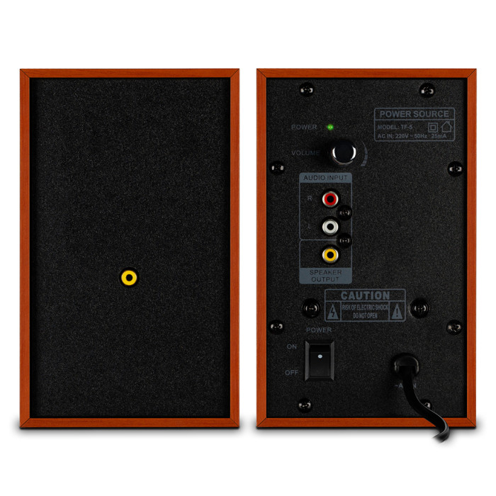 Корпус виготовлений з деревини (MDF), що не тільки додає міцності та довговічності, але й позитивно впливає на якість звуку, мінімізуючи резонанси. Розміри колонок — 180x110x120 мм, що дозволяє розмістити їх навіть у найнесподіваніших місцях.