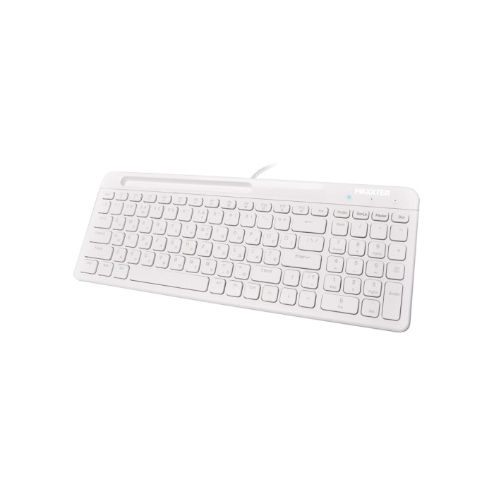 Maxxter KB-01W-UA також оснащена практичним ергономічним тримачем для зручної інтеграції планшета або мобільного телефону у вашу робочу зону, розширюючи функціональні можливості. Прогумовані ніжки надійно утримують клавіатуру на будь-якій поверхні, забезпечуючи стійкий комфорт у використанні. Надійний кабель з обплетенням гарантує довговічність і захист від пошкоджень.