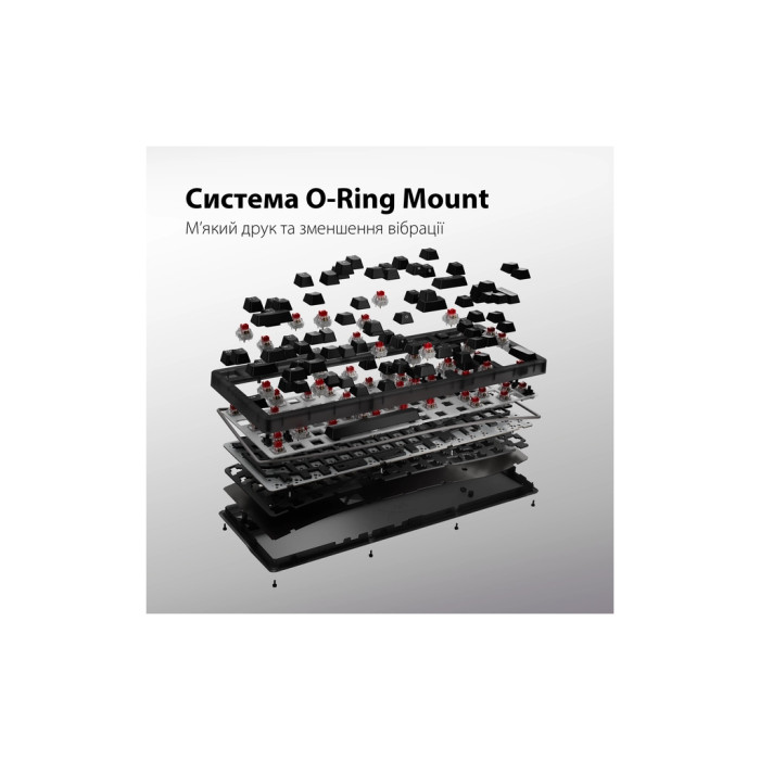 Під корпусом розташовані силіконовий демпфер та полікарбонатна пластина для поглинання вібрацій і зменшення відлуння. Це робить друк тихим та комфортним навіть під час тривалих сесій. Високопрофільний корпус із відкидними ніжками дозволяє обрати оптимальний кут нахилу для ідеальної ергономіки.
