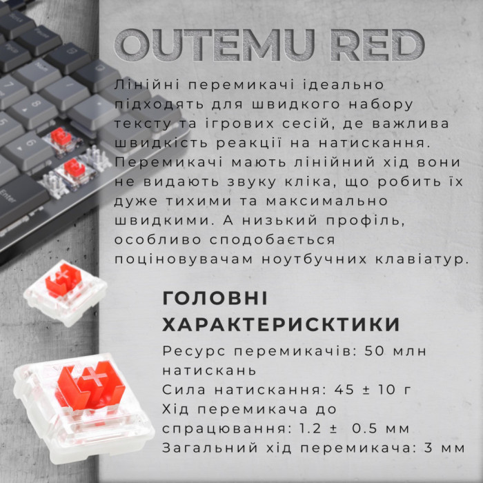 Клавіатура GamePro MK145R — це поєднання інновацій та естетики, яке створене для тих, хто цінує максимальний комфорт та продуктивність як у роботі, так і в грі. Виконана в темно-сірому кольорі, вона стильно доповнить будь-який комп'ютерний стіл. Механічна конструкція з лінійними перемикачами Outemu Red забезпечує плавність і легкість натискання, ніби клавіші ковзають на повітряній подушці. Ці перемикачі не тільки відрізняються практично безшумною роботою, що ідеально для тривалих сесій, але й витримують до 50 мільйонів натискань, гарантуючи довговічність та надійність протягом багатьох років.