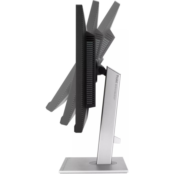 Підставка монітора моніторів ProArt дозволяє зі зручністю налаштовувати положення екрана: змінювати кут нахилу та висоту, а також повертати його навколо своєї осі та переводити в портретний режим. Такий режим зручний для роботи з довгими документами, написання програмного коду та перегляду вебсторінок. Підставку можна швидко зняти без використання інструментів, щоб потім закріпити монітор на стіні за допомогою VESA-сумісного кронштейна.