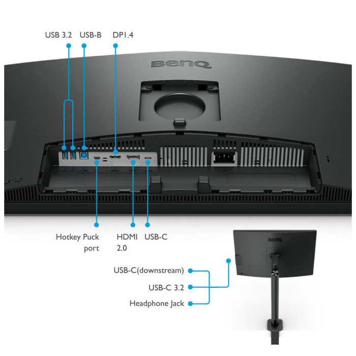 BenQ PD2706UA також підтримує велику кількість інтерфейсів для підключення периферійних пристроїв: 1 x DisplayPort, 3 x USB 3.2, 2 x USB Type-C, 1 x HDMI, що значно спрощує організацію робочого простору. Додатковий USB-концентратор робить управління пристроями легким та зручним.