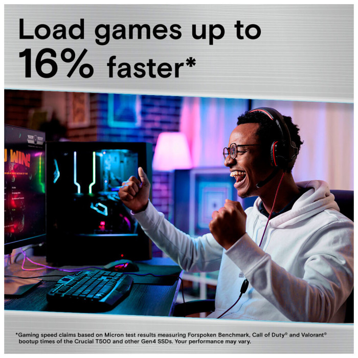Підвищте продуктивність вашої системи за допомогою твердотільного накопичувача Crucial T500 Gen4 NVMe. Насолоджуйтеся швидшими іграми – ідеально підходить для оновлень PS5. Розширте свій творчий потенціал за допомогою твердотільного накопичувача, який переміщується так швидко, як вам це потрібно. Виконання важких завдань не викликає проблем із кращою продуктивністю та енергоефективністю, а наш радіатор забезпечує тихе розсіювання тепла в елегантному дизайні.