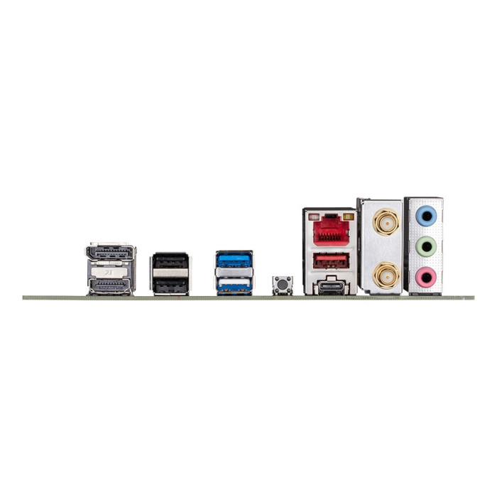 1 x USB 3.2 Gen1, 2 x SMA antenna connectors (2T2R), 1 x Q-Flash Plus button, 1 x USB 3.2 Gen1 Type-C, 1 x USB 3.2 Gen 2 Type-A, 1 x RJ45, 3 x USB 2.0, 1 x HDMI, 1 x DisplayPort, 3 x Audio