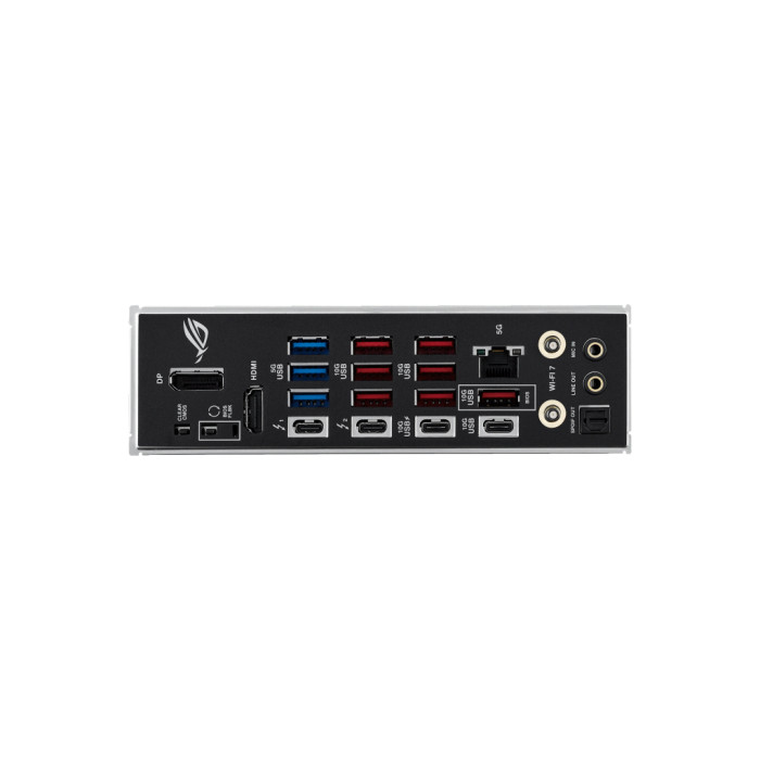 1 x Clear CMOS button, 3 x USB 3.2 Gen 1, 1 х USB 3.2 Gen2 Type-C, 1 x BIOS FlashBack Button, 1 x Wi-Fi Module, 7 x USB 3.2 Gen 2 Type-A, 2 x Gold-plated audio jack, Thunderbolt 4 40Gbps (Type-C), 1 x HDMI, 1 x DisplayPort, 1 x optical SPDIF out