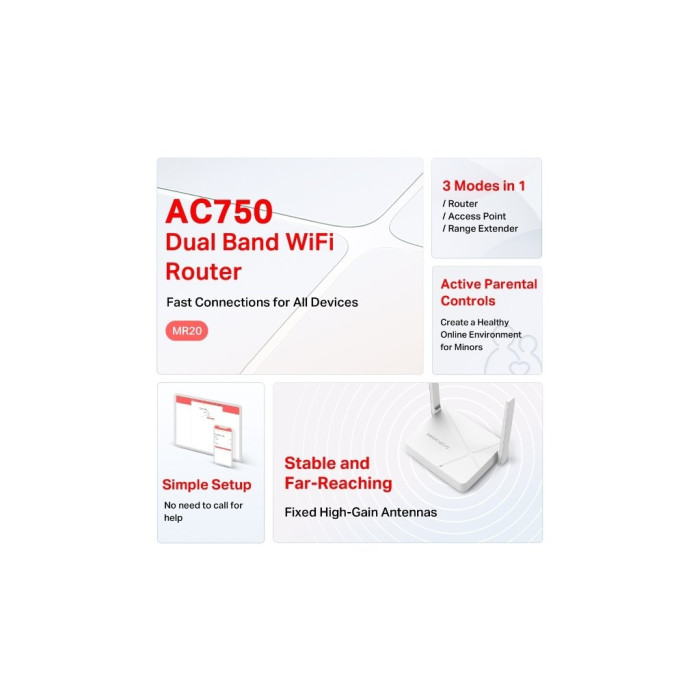 Mercusys MR20 – це відмінний вибір для всіх, хто прагне якісного зв'язку з інтернетом та простоти в експлуатації, додаючи сучасності та функціональності у ваше житло або робочий простір.
