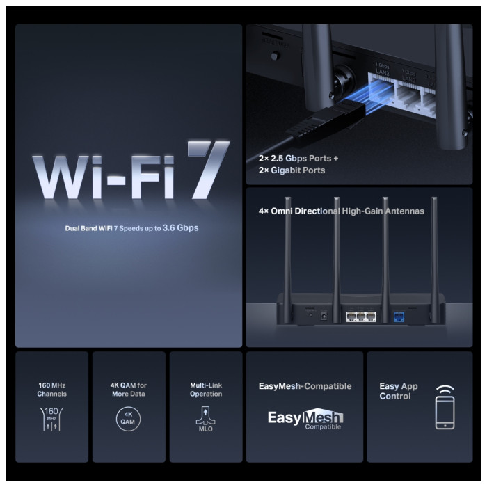 n, ac, a, g, b, ax, be, 3600 Мбіт/с, 2.4 / 5 ГГц, незнімні, Антен - 4, WPA, WPA2, WPA3, 10/100/1000/2500 BASE-T Ethernet, LAN - 3, фільтрація MAC-адрес, фільтрація IP-адрес, демілітаризована зона (DMZ), захист від DDoS-атак, SPI Firewall, VPN - так, 1 шт
