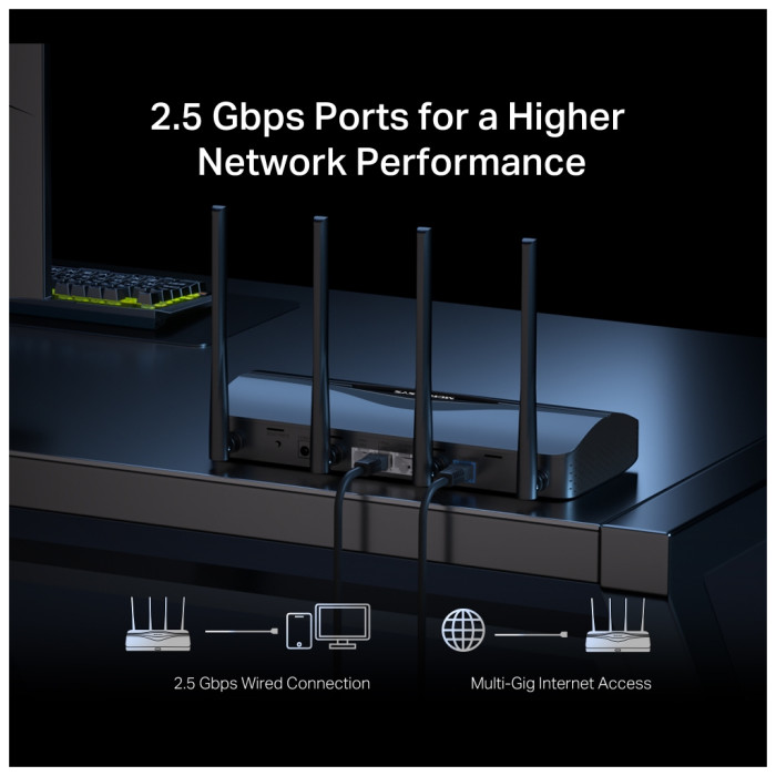 Оснащений чотирма незнімними антенами та портами зі швидкістю до 2.5 Гбіт/с, MR27BE відмінно підходить для підключення ПК, смарт-телевізорів та ігрових консолей, забезпечуючи стабільне та швидке дротове з'єднання. Використовуйте протоколи l2TP, IPv4, IPv6, PPPoE і PPTP для налаштування мережі на ваш смак.