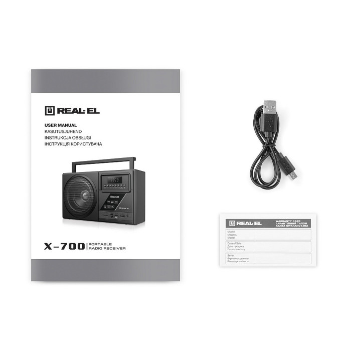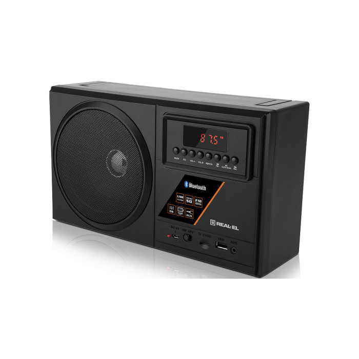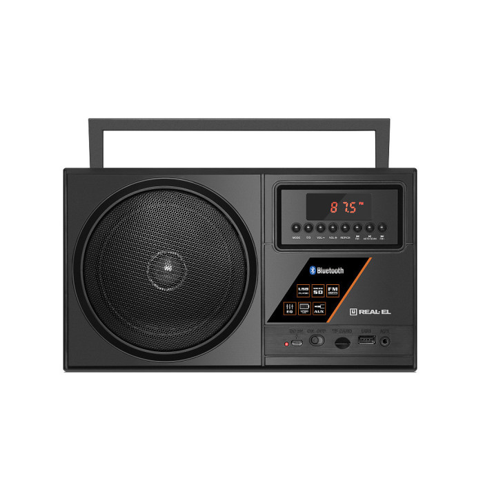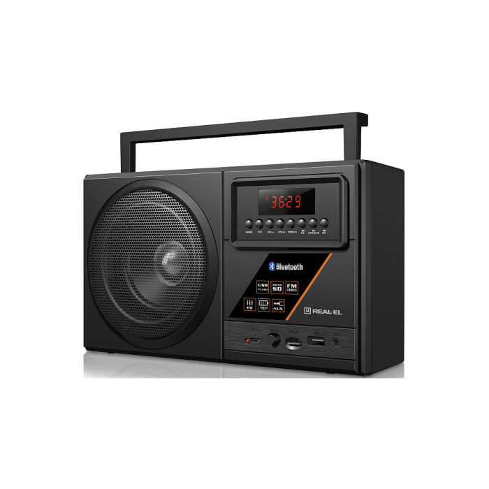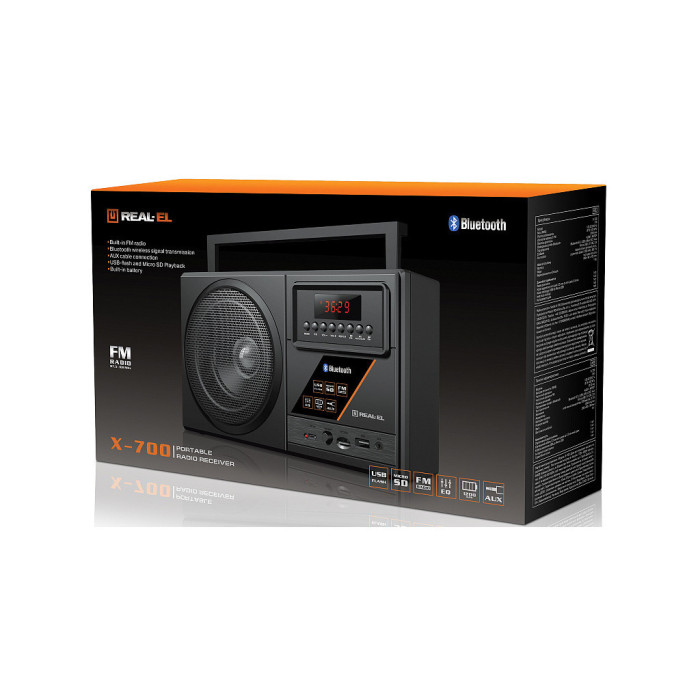 Портативний радіоприймач REAL-EL X-700 - відмінний попутник для поїздок, подорожей та прогулянок, а також чудовий компаньйон вдома і на роботі. Крім того, що Ви можете взяти з собою улюблені FM-радіостанції куди завгодно, до моделі приймача додано безліч сучасних опцій: бездротова передача сигналу через Bluetooth, відтворення з USB-flash та microSD card носіїв, AUX вхід. Вбудований еквалайзер дозволить налаштувати високі та низькі частоти, виходячи з ваших уподобань.