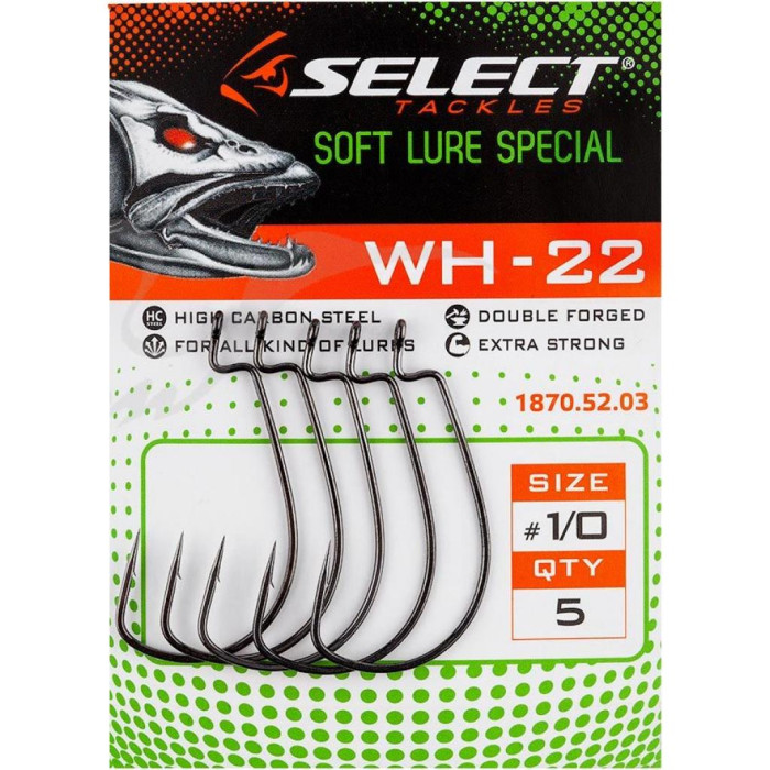 Гачок Select WH-22 - офсетник, призначений для силіконових принад невеликого розміру. Його форма зроблена таким чином, що він ідеально стає на твістери, віброхвости і ракоподібних з коротким і помірно високим тілом. Жало гачка, спрямоване вниз, притискається до приманки, що виключає зачіп оснащення за підводні перешкоди. Офсетний гачок Select WH-22 виконаний з високовуглецевої сталі з використанням зональної проковки дроту, лазерної заточки жала і подвійного оксидування, завдяки чому він є дуже міцним, гострим і менш схильним до окислення.