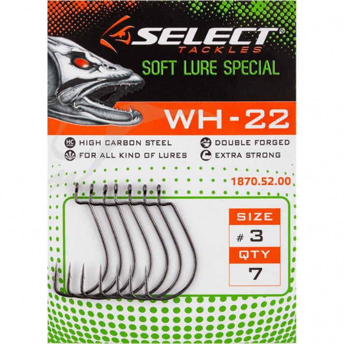 Гачок Select WH-22 - офсетник, призначений для силіконових принад невеликого розміру. Його форма зроблена таким чином, що він ідеально стає на твістери, віброхвости і ракоподібних з коротким і помірно високим тілом. Жало гачка, спрямоване вниз, притискається до приманки, що виключає зачіп оснащення за підводні перешкоди. Офсетний гачок Select WH-22 виконаний з високовуглецевої сталі з використанням зональної проковки дроту, лазерної заточки жала і подвійного оксидування, завдяки чому він є дуже міцним, гострим і менш схильним до окислення.