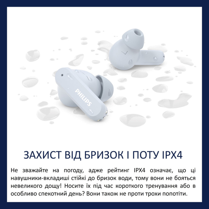 Захист від бризок і поту IPX4Не зважайте на погоду, адже рейтинг IPX4 означає, що ці навушники-вкладиші стійкі до бризок води, тому вони не бояться невеликого дощу! Носите їх під час короткого тренування або в особливо спекотний день? Вони також не проти трохи попотіти.