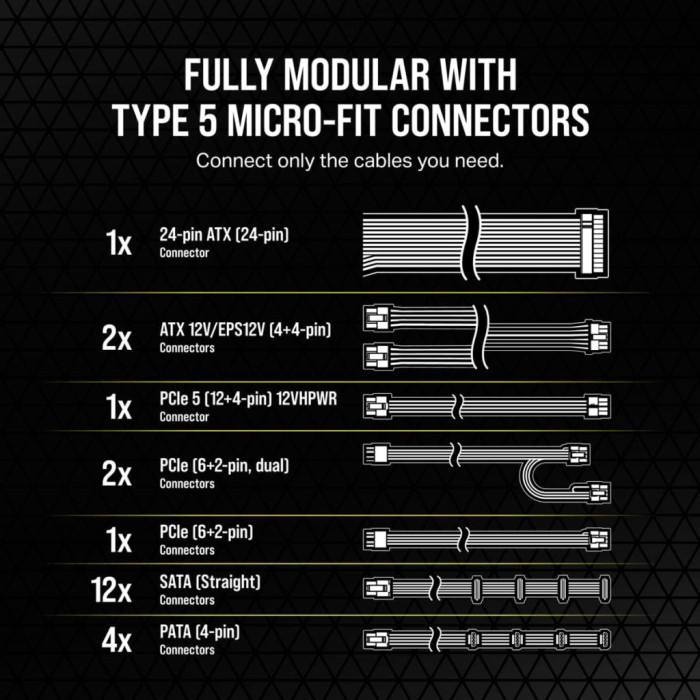Завдяки наявності 12 роз’ємів SATA та 7 роз'ємів додаткового живлення для відеокарт, блок живлення ідеально підходить для сучасних багатофункціональних систем, що вимагають більше енергії для роботи з високопродуктивними компонентами, такими як найновіші відеокарти з підключенням PCIe 5.0 12VHPWR. Роз'єми Corsair типу 5 micro-fit забезпечують простоту та гнучкість під час зборки системи.